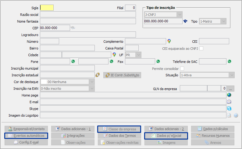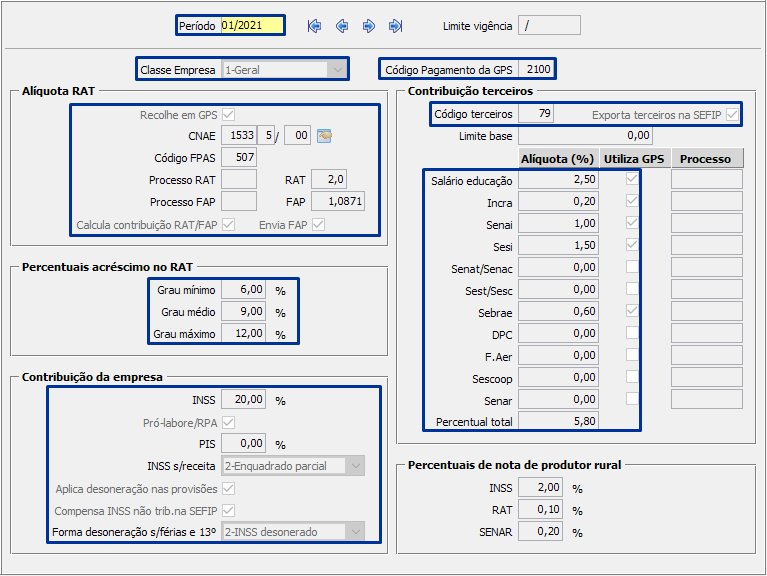 Cada tipo de empresa terá seus tributado de acordo com o FPAS e CNAE, se informar percentuais indevidos, SIGER® irá calcular na folha os percentuais informado, porém, poderá ocorrer divergência com o eSocial. Lembrando que o eSocial, calculará os tributos da empresa pela classificação tributária, que deverá ser definido no botão <Dados p/eSocial>.