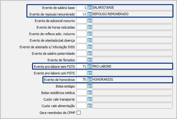 - Os eventos demonstrados na tela abaixo: “1-Salário Base” – “11-Repouso Sem. Remunerado” – “71-Pro-Labore” e “70-Honorários” devem estar em todas as empresas, pois estes eventos fazem parte da engrenagem que dispara o cálculo automático do sistema, exceto se os eventos 1 e 11 forem importados pelo sistema de ponto. Os demais eventos são tão importantes quanto os já citados, porém nem todas as empresas os possuem.