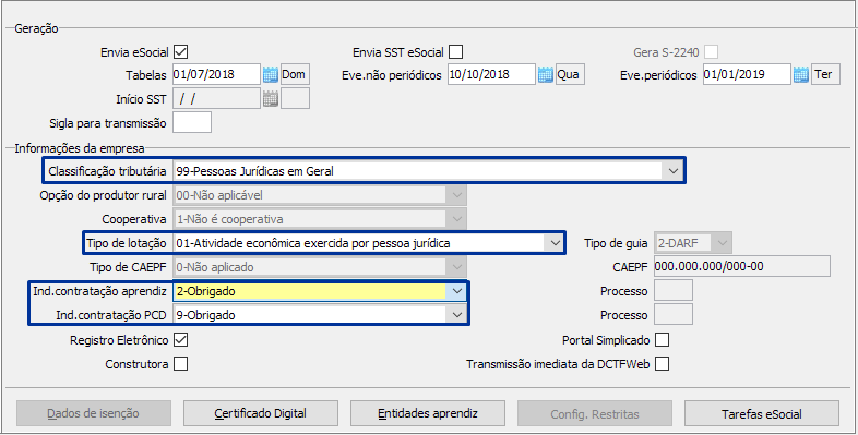 - No Classificação tributária, selecionar o tipo de classificação da empresa, pois é através desta classificação que o eSocial saberá o tipo de empresa SIMPLES ou GERAL para calcular a tributação da empresa. Empresa GERAL será código 99 e no campo Tipo de lotação, selecionar se é pessoa física, rural ou jurídica. Informar se a empresa tem a obrigação da contratação de aprendiz e PCD (Pessoa com deficiência).