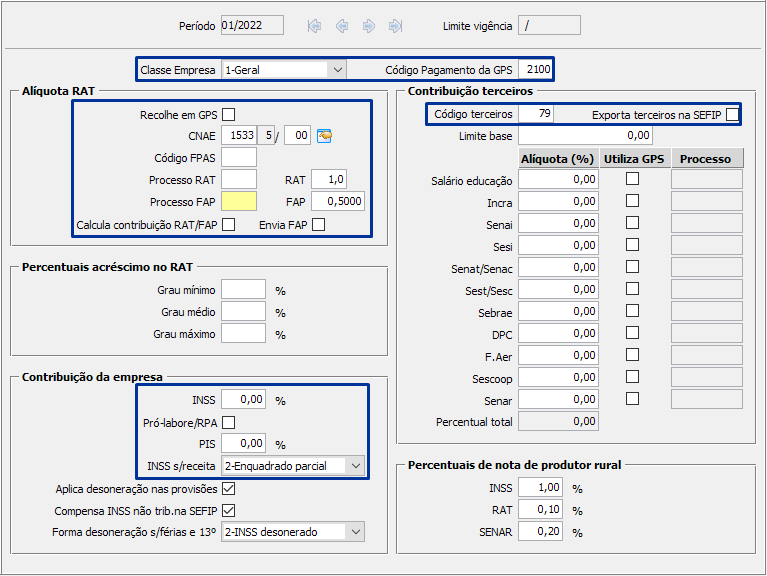 - Empresa do SIMPLES CONCOMITANTE, terá tributação sobre uma parte e outra parte sem tributação. A configuração no botão <Classe da empresa> deverá ficar como GERAL e código GPS 2100, informar o percentUal do RAT/FAP, código de terceiros e não marcar a flag para calcular.
