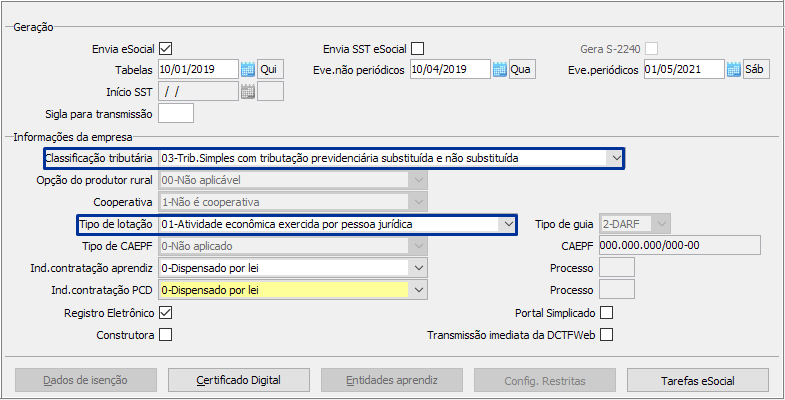 Cada tipo de empresa terá seus tributado de acordo com o FPAS e CNAE, se informar percentuais indevidos, SIGER® irá calcular na folha os percentuais informados, porém, poderá ocorrer divergência com o eSocial. Lembrando que o eSocial, calculará os tributos da empresa pela classificação tributária, que deverá ser definido no botão <Dados p/eSocial>.