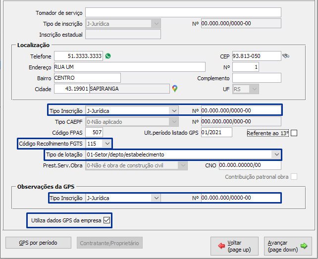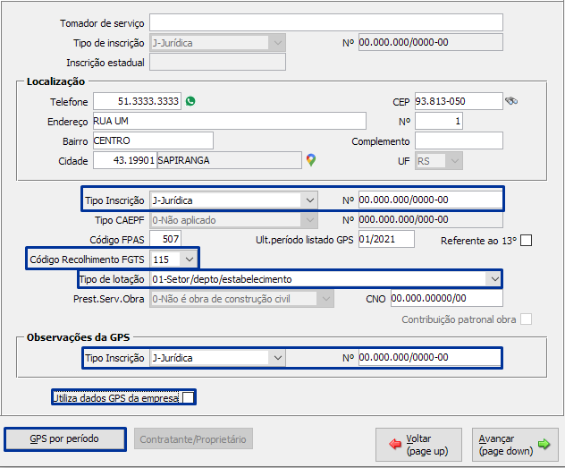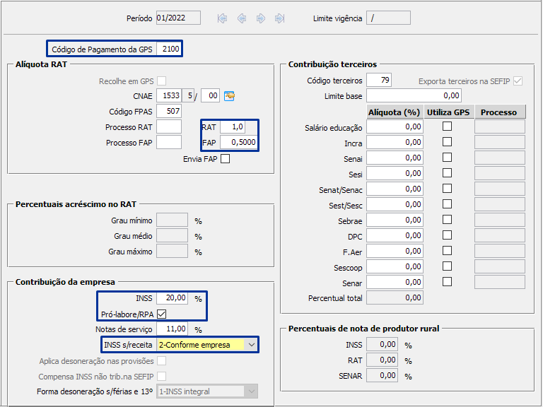 Botão <GPS por período> informar o percentual RAT/FAP e o INSS empresa e no campo INSS s/receita, alterar para NÃO enquadrado.