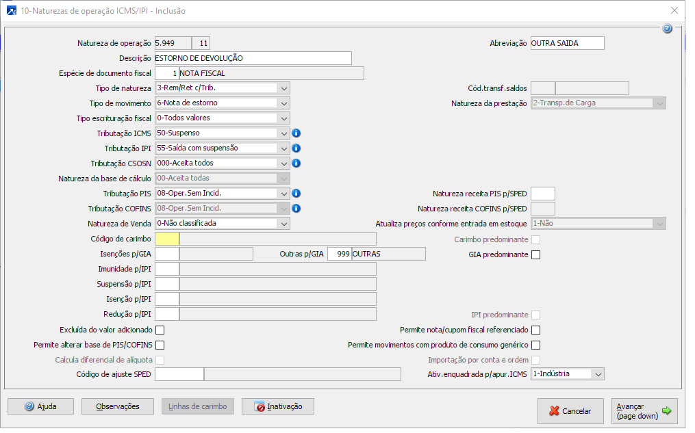 Tipo de Natureza: Somente com opções 2- Remessa/ Retorno ou 3- Rem/Ret c/ Trib.