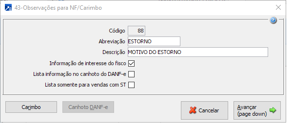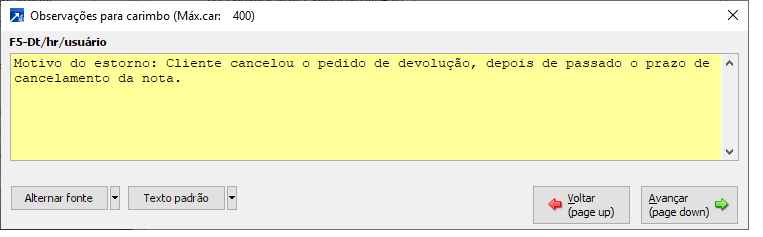 Informar na observação: Texto padrão Estorno “Nota fiscal de Estorno da XX/XXXX, emitida em XX/XX/XXXX.”