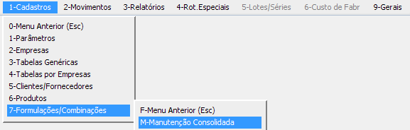 Tudo começa pelo menu 1.7-M -> Manutenção consolidada de formulações