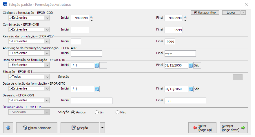 A primeira tela exibida após acesso ao menu é uma seleção padrão para filtragem de formulações.