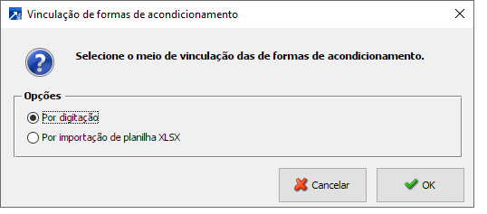 Ao acessar o menu, há a possibilidade de realizar a vinculação das formas de acondicionamento de duas formas: digitação ou planilha.