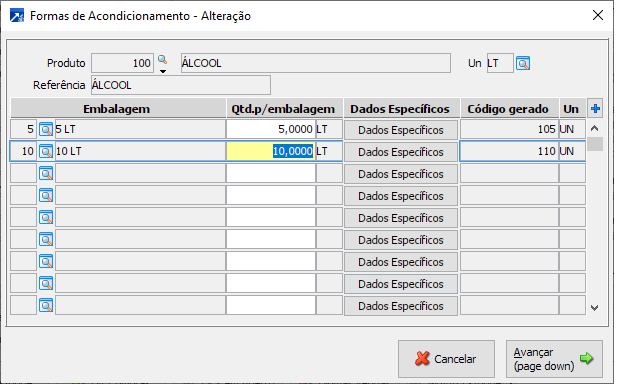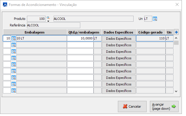 Vale ressaltar que a unidade do produto forma de acondicionamento deve ser diferente da unidade do produto base de acondicionamento, pois a partir do momento que ele é envasado, não vai ser controlado em litros (tendo como base o exemplo das imagens), por exemplo.