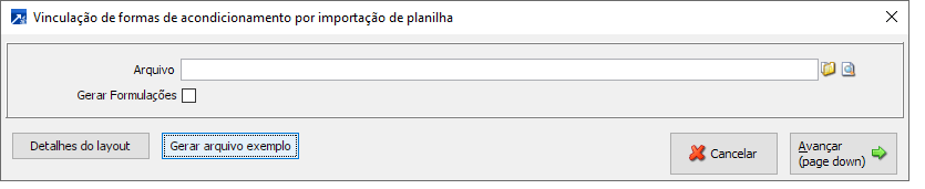 Importação de planilha: Esta opção permite ao usuário vincular as formas de acondicionamento através de uma planilha. Pode ser gerado um arquivo exemplo, que já tem as coluna prontas para preenchimento, e assim realizar a inclusão dos dados. É possível visualizar o layout através do botão "Detalhes do layout".