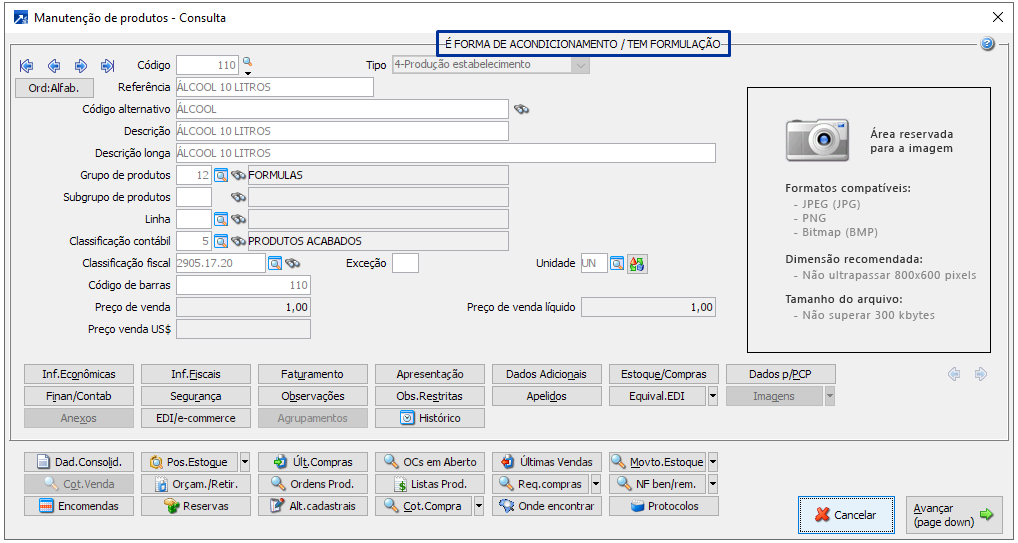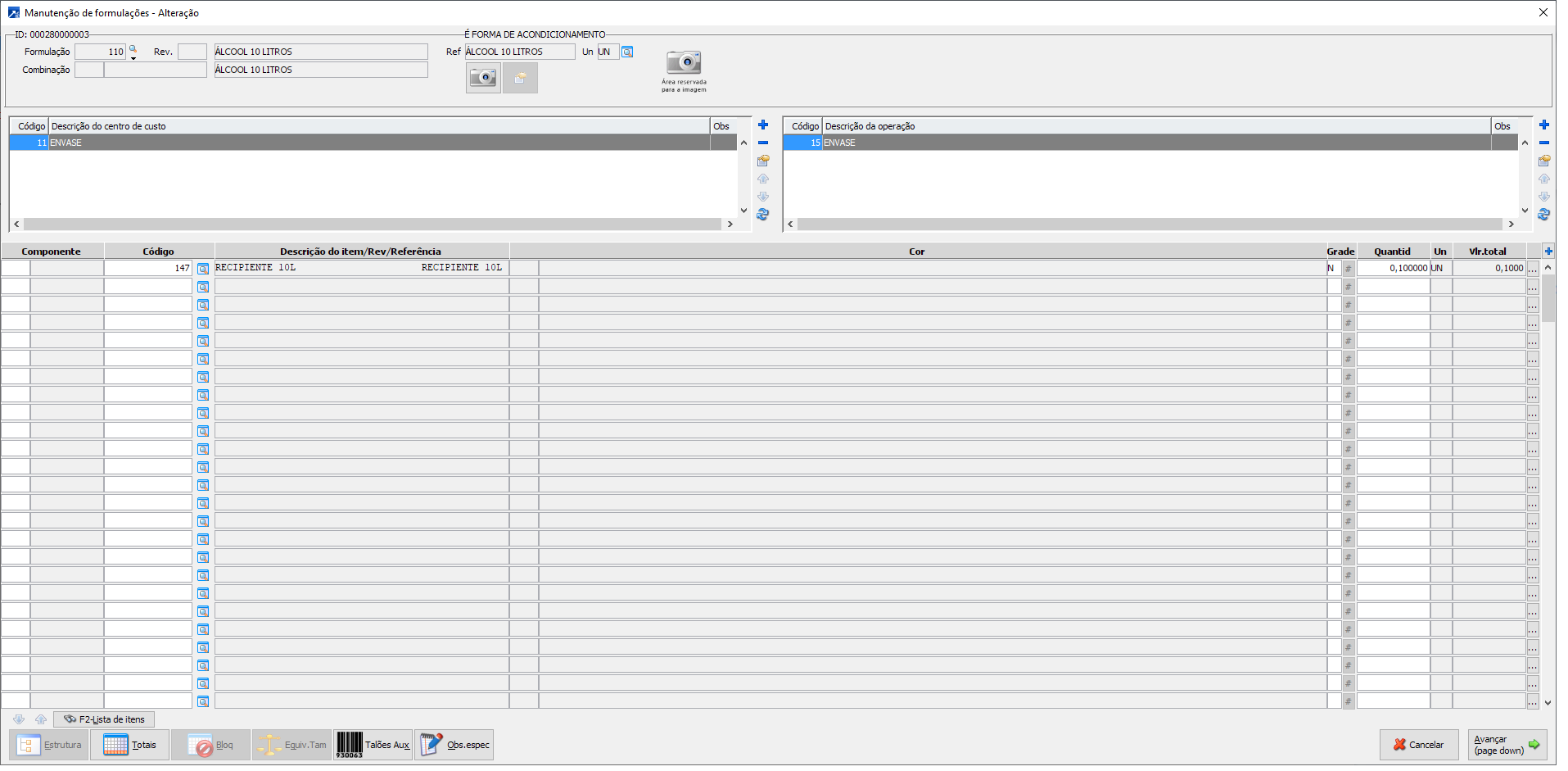 Um detalhe importante é que na formulação do produto forma de acondicionamento, quando é indicado consumo de embalagem, devemos ficar atentos a quantidade que será consumida. Podemos notar o caso da formulação do produto de código 110, que é uma forma de acondicionamento de 10L. O consumo deve ser 1 embalagem para cada 10 litros. Desta forma para cada 10 litros deve ser consumido 0,1 embalagem, assim o cálculo do consumo ficará correto.