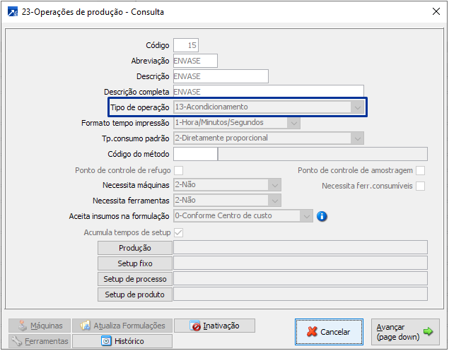 Um detalhe importante é que na formulação do produto acondicionado deve ter uma operação previamente configurada para ter o tipo de operação (