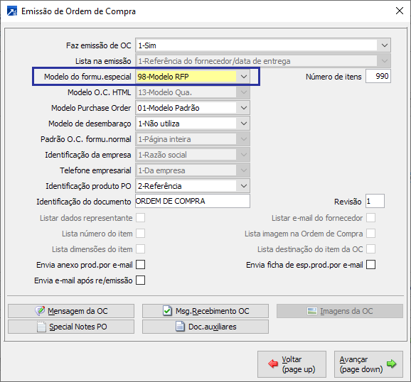 Para definir a utilização do formulário configurável para Ordem de Compra, acessar menu 1.2-A do módulo de Compras, botão <Compras>, botão <Emissão OC>, campo "Modelo do formu.especial".