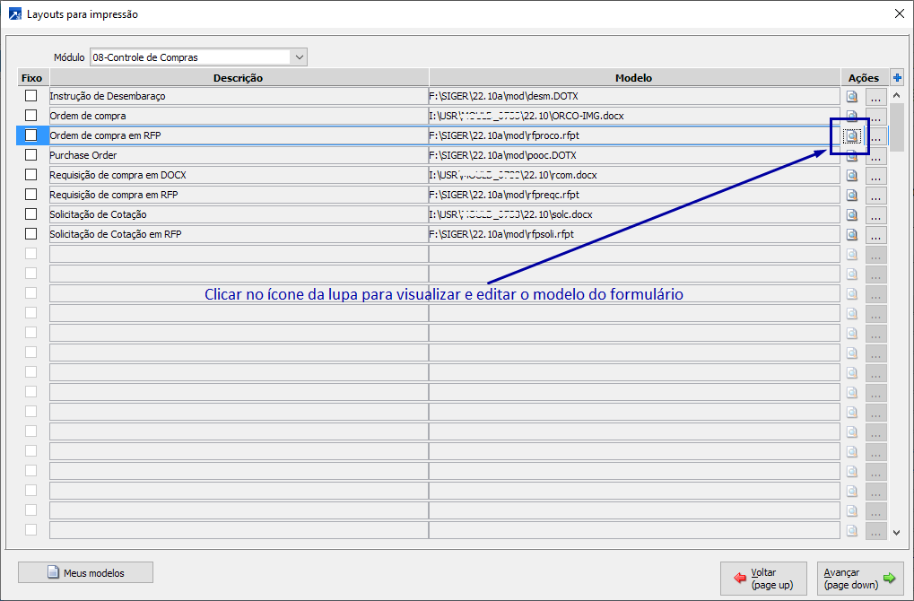 Será exibida janela de "Layouts para impressão" do módulo 08-Controle de Compras.