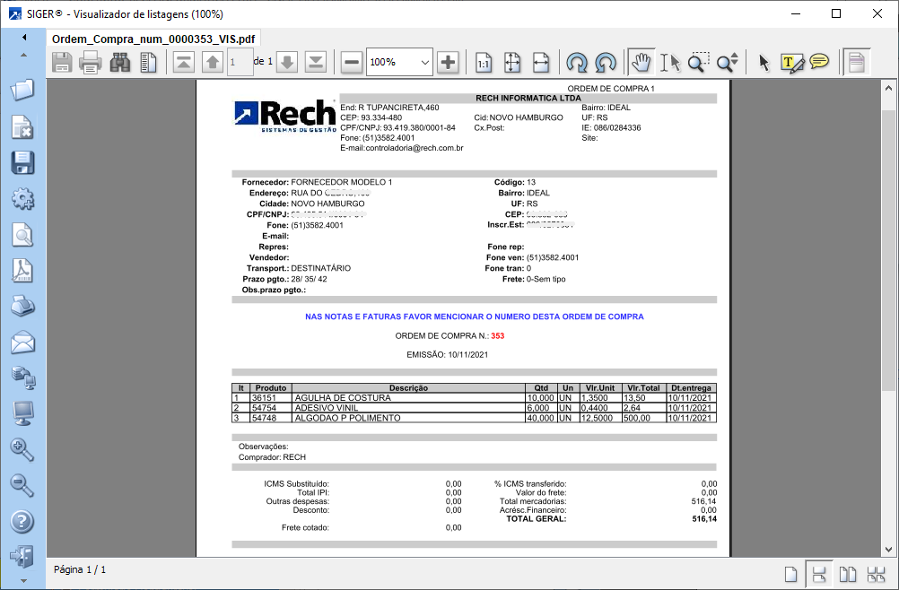 A Ordem de Compra utiliza formulário configurável, que permite a alteração do layout pelo usuário, conforme suas necessidades e regras de negócio da empresa.