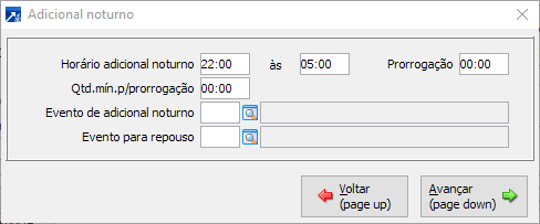O botão de adicional noturno serve para informar o horário de inicio e fim para apuração do adicional noturno. Informar o evento de adicional noturno nesta tela quando utilizas o calculo automático pelo calendário. Se deixar em branco SIGER® vai calcular pelo evento informado no cadastro da Empresa em 1.2-A em eventos automáticos.