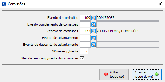 Nesta aba, eventos específicos para calculo de médias de comissão informando também o período diferenciado para apuração de medias, se houver algo diferente em Acordo Coletivo. Importante ler a linha amarela em cada item antes de preencher os campos.