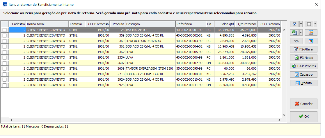 Na manutenção consolidada ou nos menus FAT 2.9-G ou FAT 2.B-G, a geração da pré-nota para retorno é feita a partir da seleção padrão de itens das notas de beneficiamento/remessa/retorno. Após configurar os filtros desejados e confirmar a seleção, será aceita a janela de seleção dos itens a retornar (mesma janela acima).