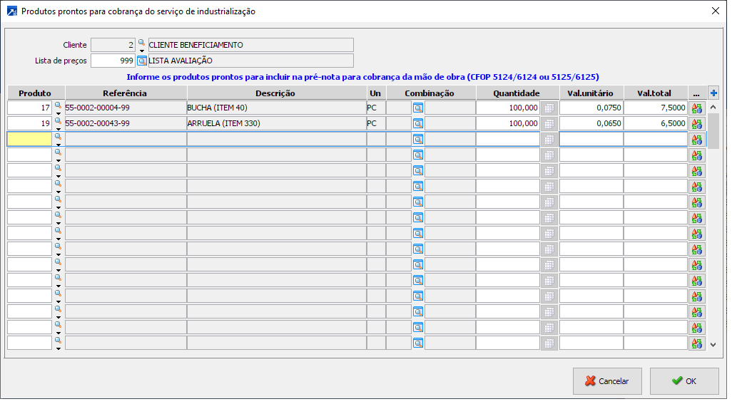 Aceita a lista de produtos prontos retornados/produzidos para a cobrança do serviço de industrialização. A lista de produtos é aceita para cada cliente das notas de remessa selecionadas. Esses produtos serão incluídos na pré-nota com CFOP 5124/6124 ou 5125/6125, de acordo com a CFOP dos itens das notas de remessa selecionadas.