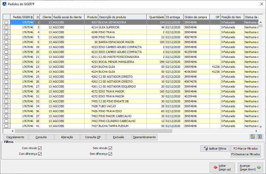 Carrega o grid "Pedidos do SIGER®", com a funções de cancelamento, consulta, alteração, exclusão e desmembramento do pedidos, também permite consultar a OP vinculada ao pedido.
