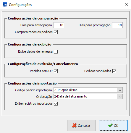 Neste botão estão as configurações disponíveis para comparação, exibição, exclusões/cancelamentos e importação dos pedidos.