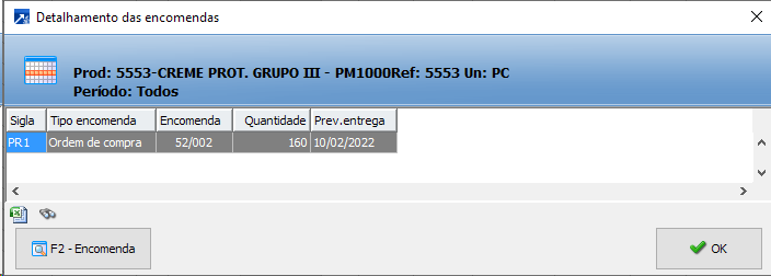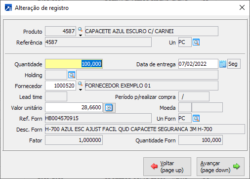 No grid são exibidos os produtos de acordo com seus fornecedores, a quantidade e o período para a próxima compra, levando em consideração o lead time de compra do fornecedor e/ou holding (intervalo de tempo entre a compra e a entrega de um pedido do fornecedor).