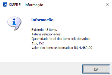 Valor previsto de compra, quantidade de registro selecionados do Grid, quantidade total que será gerada.