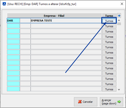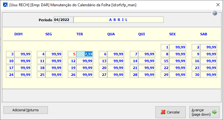 MENU 1.A-A clica no dia que será definido feriado, exemplo o dia 05/04/2022 e pressione a tecla F7, o dia ficará em vermelho, informe as horas do feriado e clica no botão <Avançar>, na segunda tela vai aparecer o grid com as empresas, para selecionar em quais será aplicado o feriado no dia 05 de abril. Marca as empresas e clica no botão <Avançar> e confirma, na próxima tela, poderá selecionar os turnos que serão alterados.
