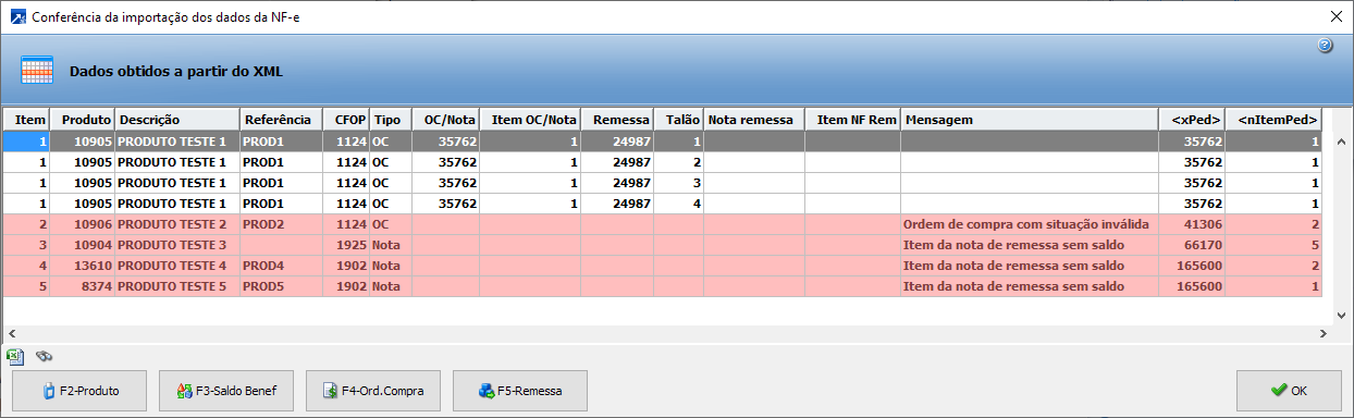 Talões do retorno importados a partir da ordem de compra, tags <xPed> e <nItemPed> dos itens com CFOP de cobrança.