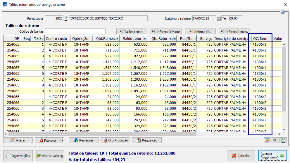 Obs.: não há informação do talão retornado no XML, caso seja um retorno parcial de uma OC/Item (remessa), serão carregados todos talões para janela abaixo e o usuário deve remover o que for excedente a quantidade retornada.
