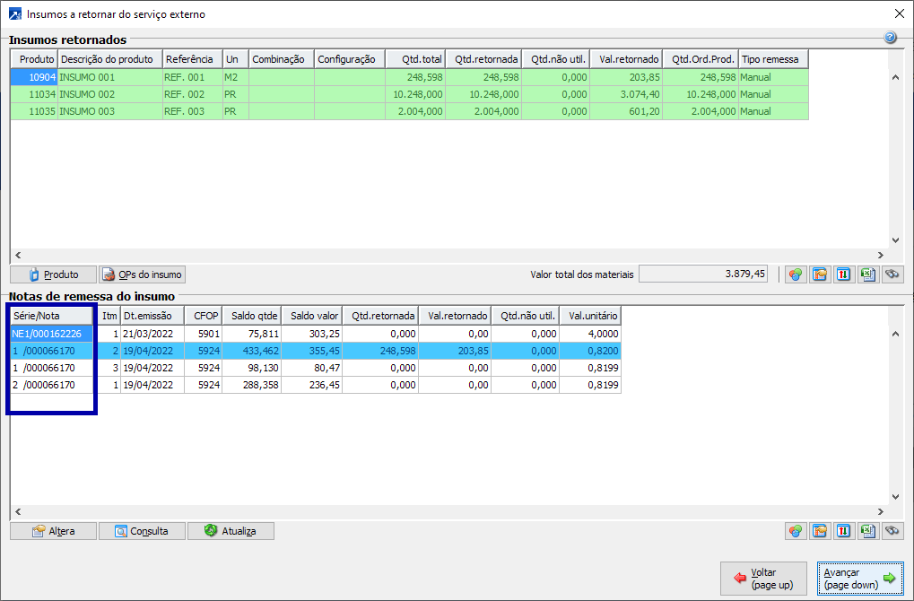 Seleção das notas retornadas (beneficiamento) ocorre pelos itens com CFOP de retorno: