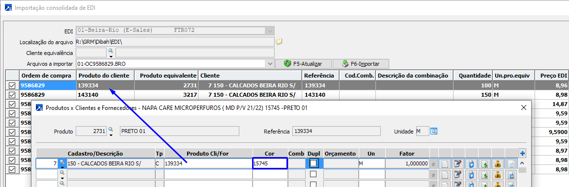 Acima o demonstrativo das informações entre a importação do pedido e a equivalência do produto. A informação da "cor" que também consta no arquivo é preenchida na coluna "Cor".