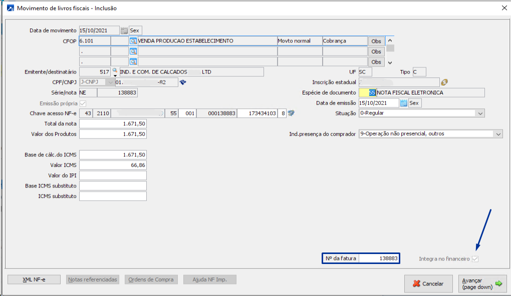 Caso não queira que a integração com o Financeiro ocorra, deve deletar o número da Fatura e desmarcar o campo "Integra no financeiro".