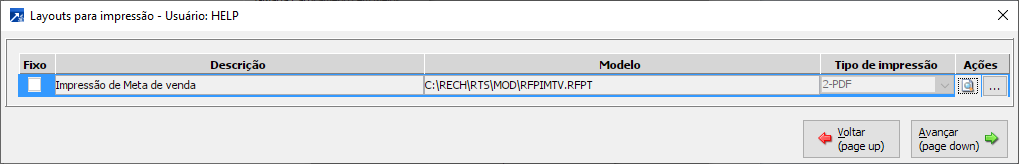 Este botão permite que seja consultado o modelo de impressão que será utilizado para a listagem de metas de vendas. A impressão ocorre com um modelo RFP, portanto ele pode ser modificado conforme a necessidade para ajustar posição dos campos, cores, literais, seções, etc.