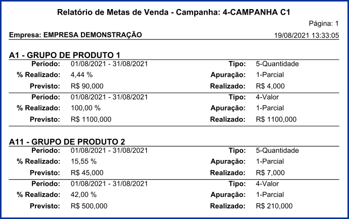 Após o cadastramento de campanhas e metas de venda é possível visualizar todas as informações na forma de um relatório impresso. O modelo utilizado para impressão de metas permite configuração, possibilitando que o relatório seja formatado como for desejado. A impressão das metas de venda está disponível no menu FAT 4.D-J.