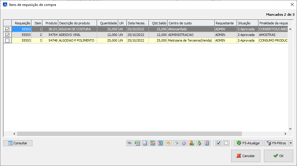 Após o filtro dos itens das requisições (seleção padrão de Itens das requisilçies), abre a jenala para marcar os produtos a serem carregados para solicitação.