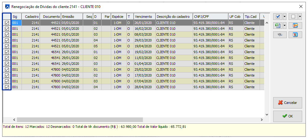 Ao avançar na janela de inclusão da Renegociação de Dívidas, o SIGER® exibe a janela "Renegociação de Dívidas com o código do cadastro", são carregados os Documentos vencidos automaticamente, com base na data de referência informada na primeira janela, os Documentos já estão marcados, basta selecionar o botão <OK>.