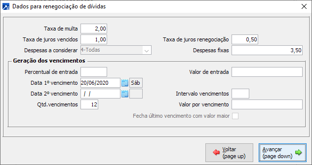 Os campos padronizados serão carregados automaticamente, mas podem ser alterados nessa etapa, por exemplo, o usuário pode alterar ou zerar os percentuais de multa, juros e despesas fixas.