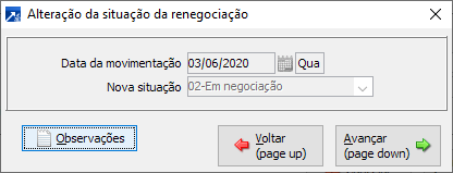 Ao avançar para gravar a inclusão da Renegociação, o SIGER® exibe a janela Alteração da situação da renegociação, nessa janela os campos "Data da movimentação" e "Nova situação" estão desabilitados, no botão <Observações> pode ser utilizado para inserir informações relevantes a Renegociação. Para concluir a inclusão da Renegociação basta avançar.
