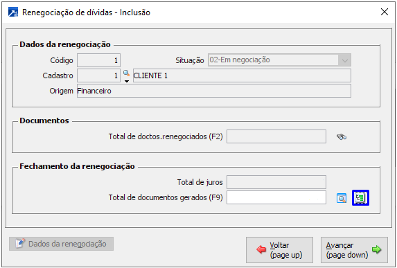 • Habilita o campo "Total de documentos gerados" para informar o valor total da renegociação;