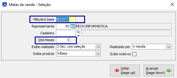 Caso, tenha optado por exibir o “realizado” ao avançar será possível fazer a seleção, de acordo com a sua necessidade (cliente, faturamento, produtos e representantes).