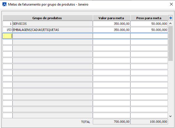 Nesse caso, o valor da meta será divido em dois grupos de produtos sendo o grupo de “SERVIÇOS” e o grupo de “EMBALAGENS CAIXAS E ETIQUETAS”.