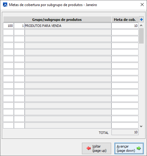 No botão de Meta de Cobertura, será inserido o valor que deve ser rateado por grupo/subgrupo, de produtos.