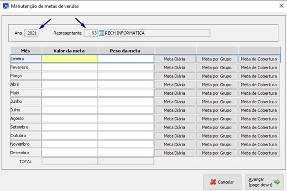 Primeiramente deverá ser digitado o ano e o código do representante a que se destina a meta que será imputada no sistema.