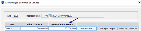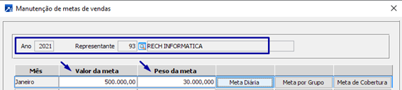Exemplo: Informamos que em janeiro de 2021 o valor meta é de R$ 500.000,00 e o peso para meta é de 100.000,00 kilos para o representante 93 – Rech Informática