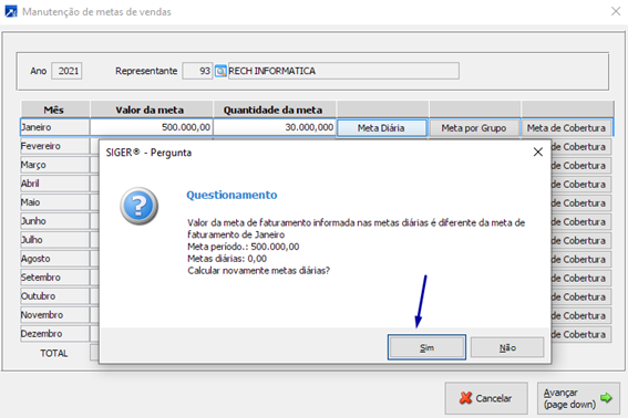 O botão de Meta por Grupo e Meta de Cobertura, não são obrigatórios, caso a empresa não queira controlar por grupo e subgrupo. O mesmo acontece com a quantidade da meta.