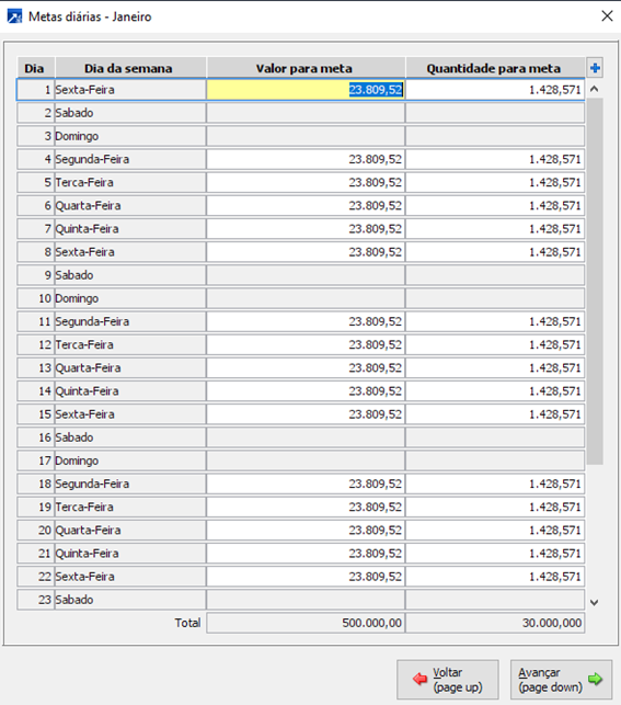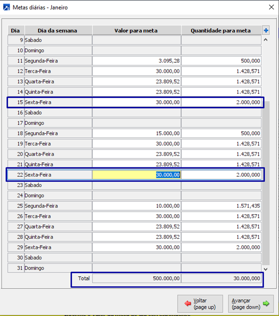 Por exemplo: Se eu sei que na sexta feira a empresa vende mais, eu posso alterar os valores constantes nestas datas. Porém, sempre cuidando para que o sistema “feche” com os totais informados para aquele mês.