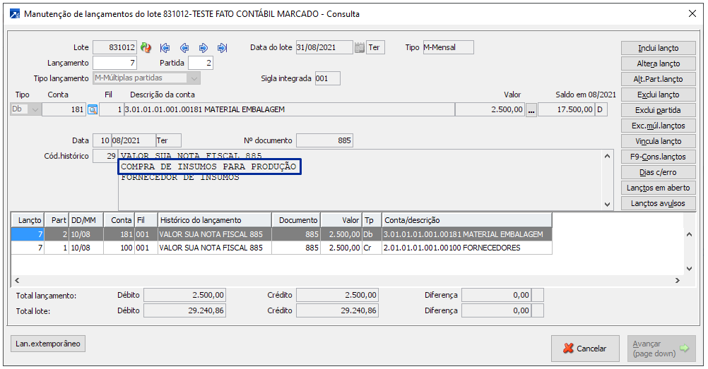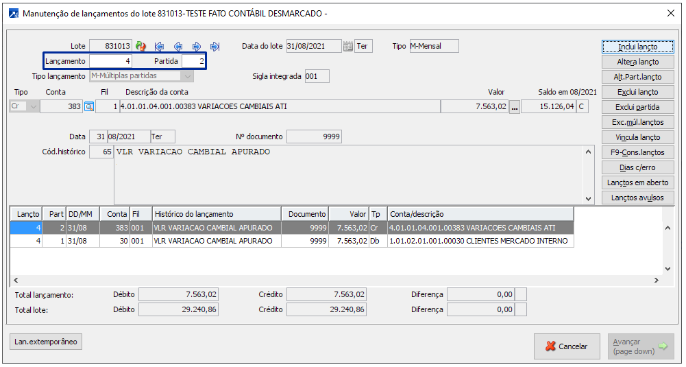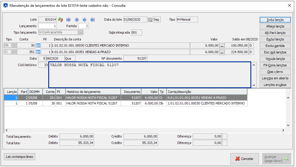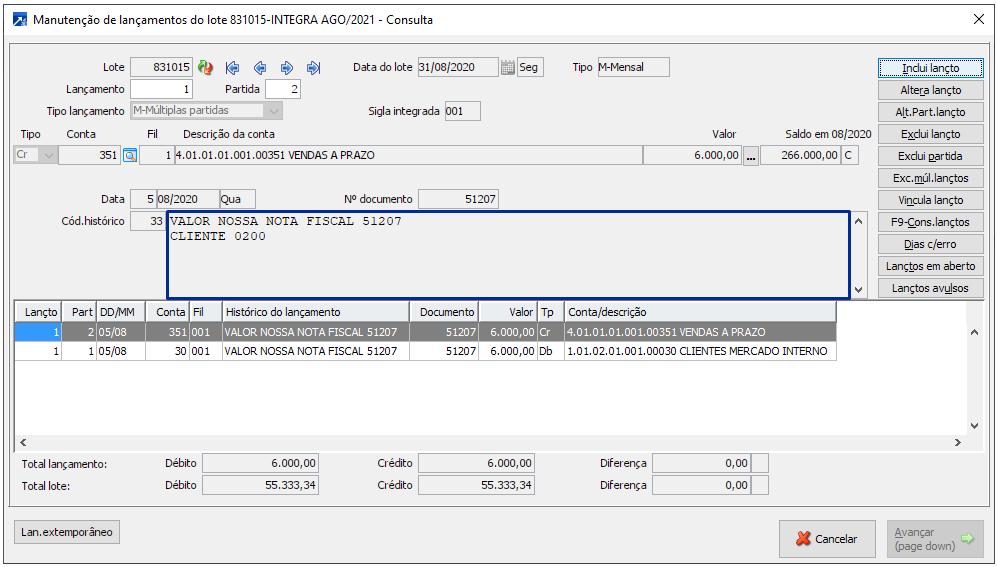 Se desmarcado integrará os lançamentos por conta/histórico acumulando os valores dos documentos, lançamento a crédito, exemplo na consulta do lote contábil, menu CTB 2.1-C.