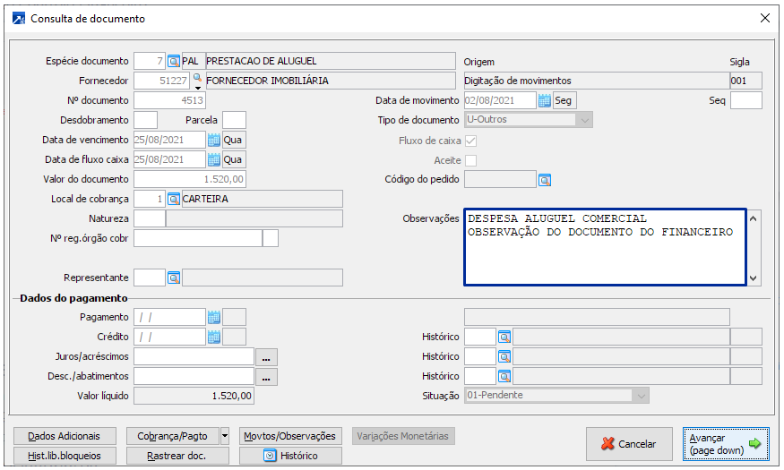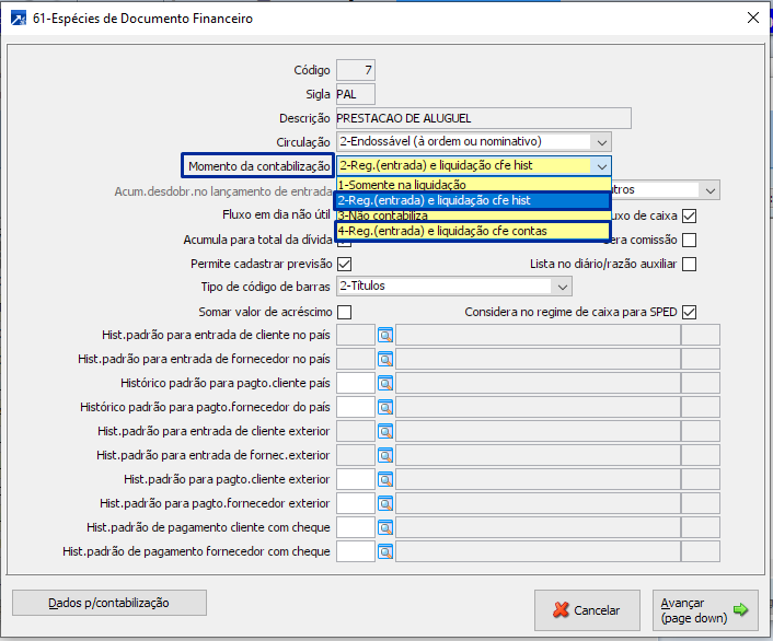 Obs.: Para integrar a observação do documento do financeiro, o mesmo não pode ter origem de nota fiscal e a configuração do momento da contabilização, campo "Momento da contabilização", da espécie de documento do financeiro, deve ser com registro na entrada do documento, ou seja, com as opções "2-Reg.(entrada) e liquidação cfe histórico" ou "4-Reg.(entrada) e liquidação cfe contas".