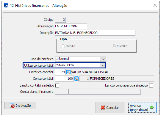 2-Crédito: Integra a observação da nota para lançamento da contrapartida (conta do fornecedor)