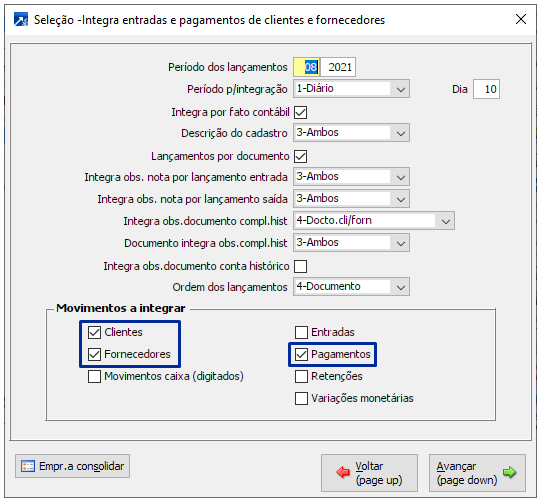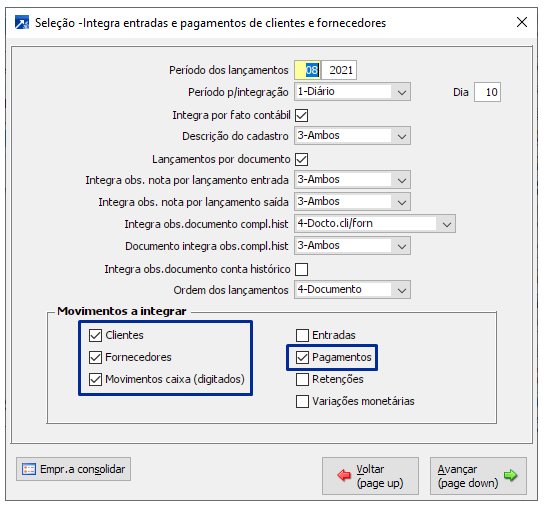 Se marcado este campo serão integrados os movimentos de pagamentos de documentos, compreendem, também, como pagamento as liquidações de clientes, caso marcado o campo "Clientes".